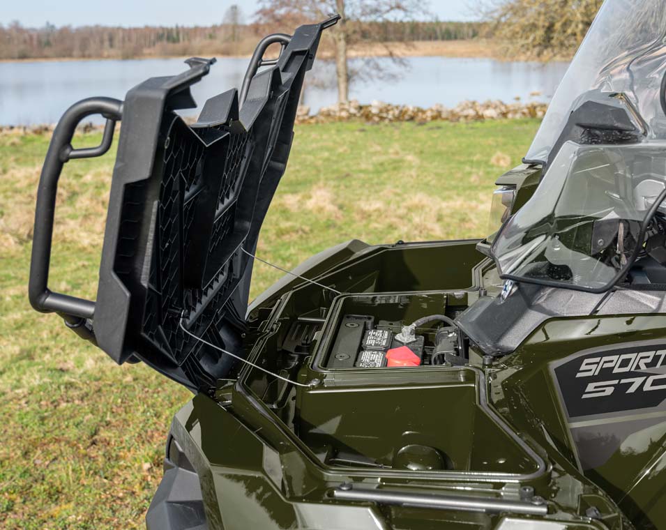 - Extensor de Parrilla Delantera, Puerto de Carga de 12 voltios, Precableado para Calentadores de Manos y Pulgares, Puerto de Carga de Batería en Faro Principal, Soporte para Winch Incluido, RIDE COMMAND+ con la Compra del Accesorio, Defensa delantera, Extensión de rack trasero